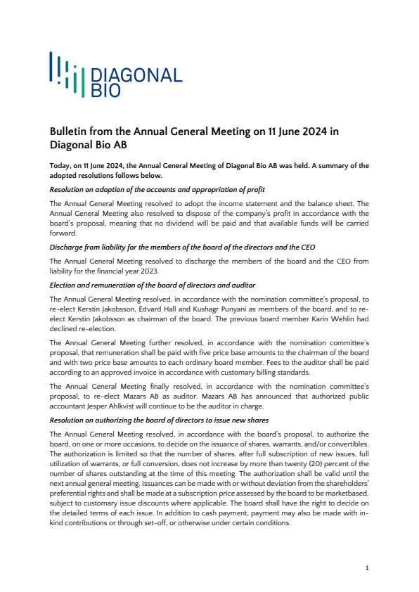 Bulletin from the Annual General Meeting on 11 June 2024 in Diagonal Bio AB