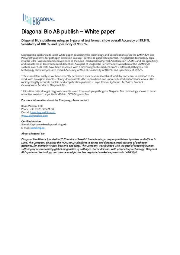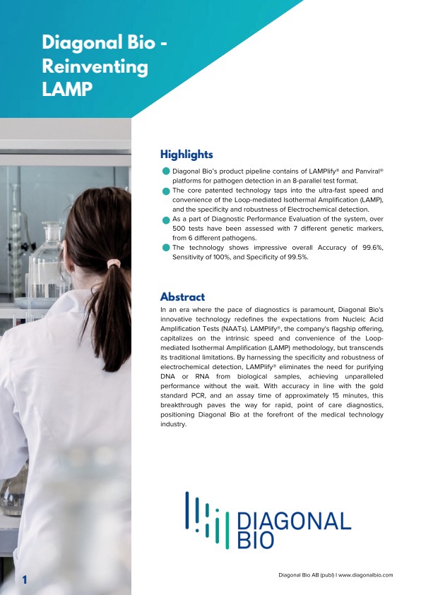 Diagonal Bio AB was founded in 2020 and is a Swedish biotechnology company with headquarters and offices in Lund. The Company develops the PANVIRAL® platform to detect and diagnose small sections of pathogen genomes, for example viruses, bacteria and fungi. The Company was founded with the goal of reducing human suffering by revolutionizing global diagnostics of pathogen-borne diseases with proprietary technology. Diagonal Bio’s patented technology can also be used for the less regulated market segments via LAMPlify®.