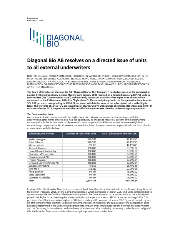 Diagonal Bio AB resolves on a directed issue of units to all external underwriters