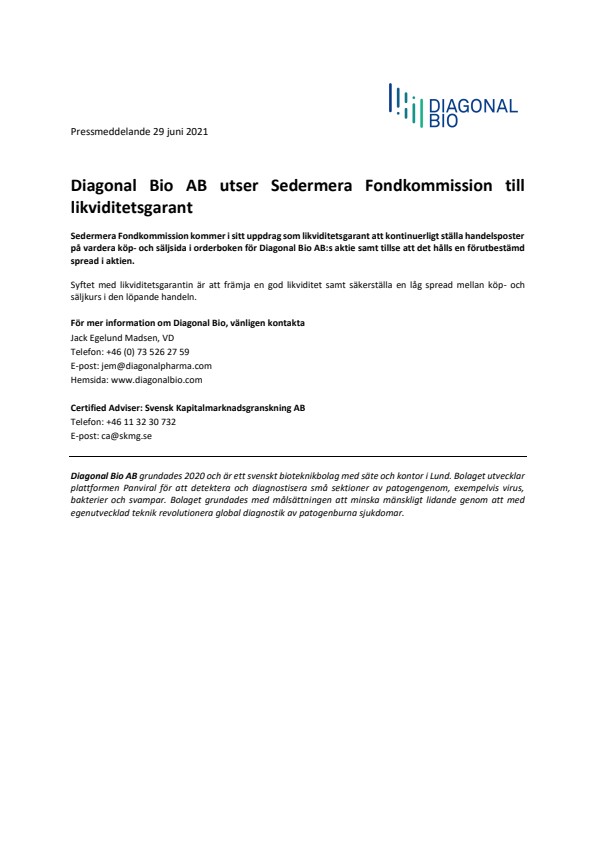 Diagonal Bio AB utser Sedermera Fondkommission till likviditetsgarant