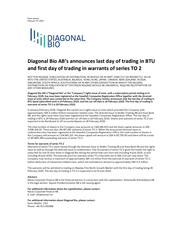 Diagonal Bio AB’s announces last day of trading in BTU and first day of trading in warrants of series TO 2