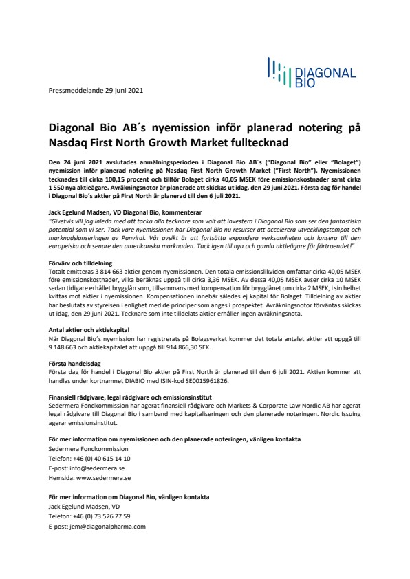 Diagonal Bio AB´s nyemission inför planerad notering på Nasdaq First North Growth Market fulltecknad