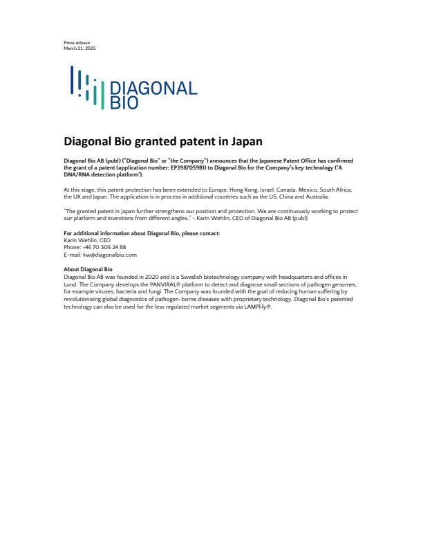 “The granted patent in Japan further strengthens our position and protection. We are continuously working to protect our platform and inventions from different angles.” – Karin Wehlin, CEO of Diagonal Bio AB (publ)