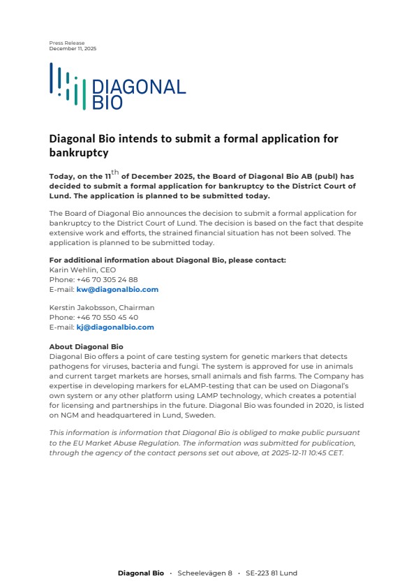 Today, on the 11th of December 2025, the Board of Diagonal Bio AB (publ) has decided to submit a formal application for bankruptcy to the District Court of Lund. The application is planned to be submitted today.