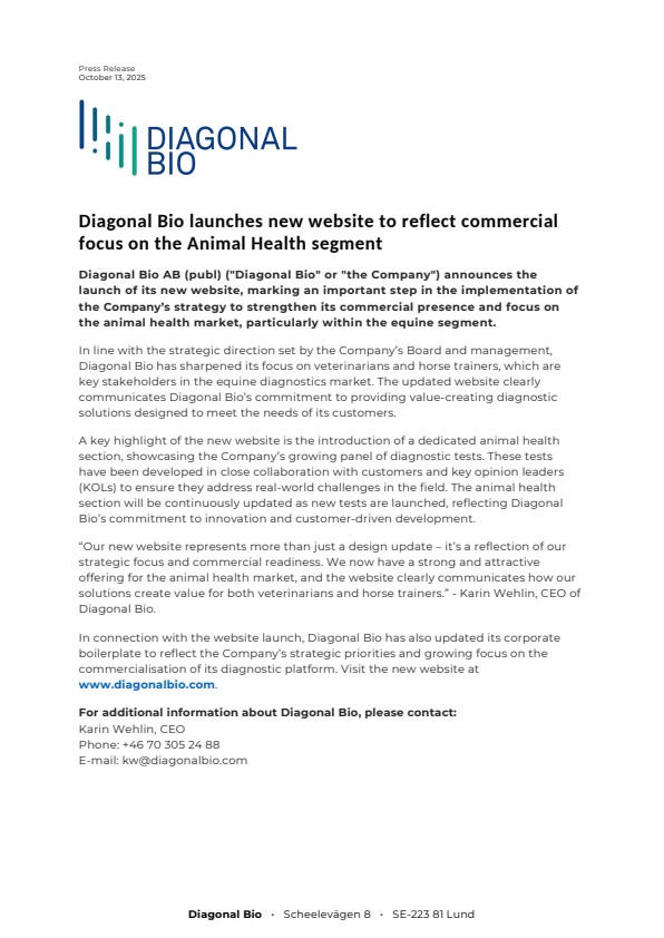 Diagonal Bio AB (publ) (“Diagonal Bio” or “the Company”) announces the launch of its new website, marking an important step in the implementation of the Company’s strategy to strengthen its commercial presence and focus on the animal health market, particularly within the equine segment.