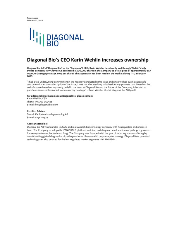 “I had a top underwriting commitment in the recently conducted rights issue and since we had such a successful outcome with an oversubscription of the issue, I was not allocated any units besides my pro-rata part. Based on this and of course based on my strong belief in the team at Diagonal Bio and the future of the Company, I decided to purchase shares in the market to increase my holdings.” – Karin Wehlin, CEO of Diagonal Bio AB (publ)