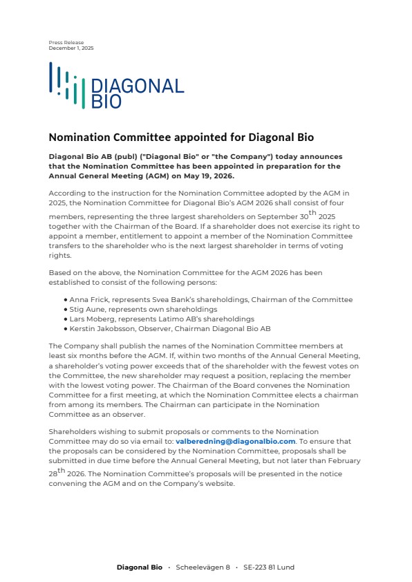Diagonal Bio AB (publ) (“Diagonal Bio” or “the Company”) today announces that the Nomination Committee has been appointed in preparation for the Annual General Meeting (AGM) on May 19, 2026.